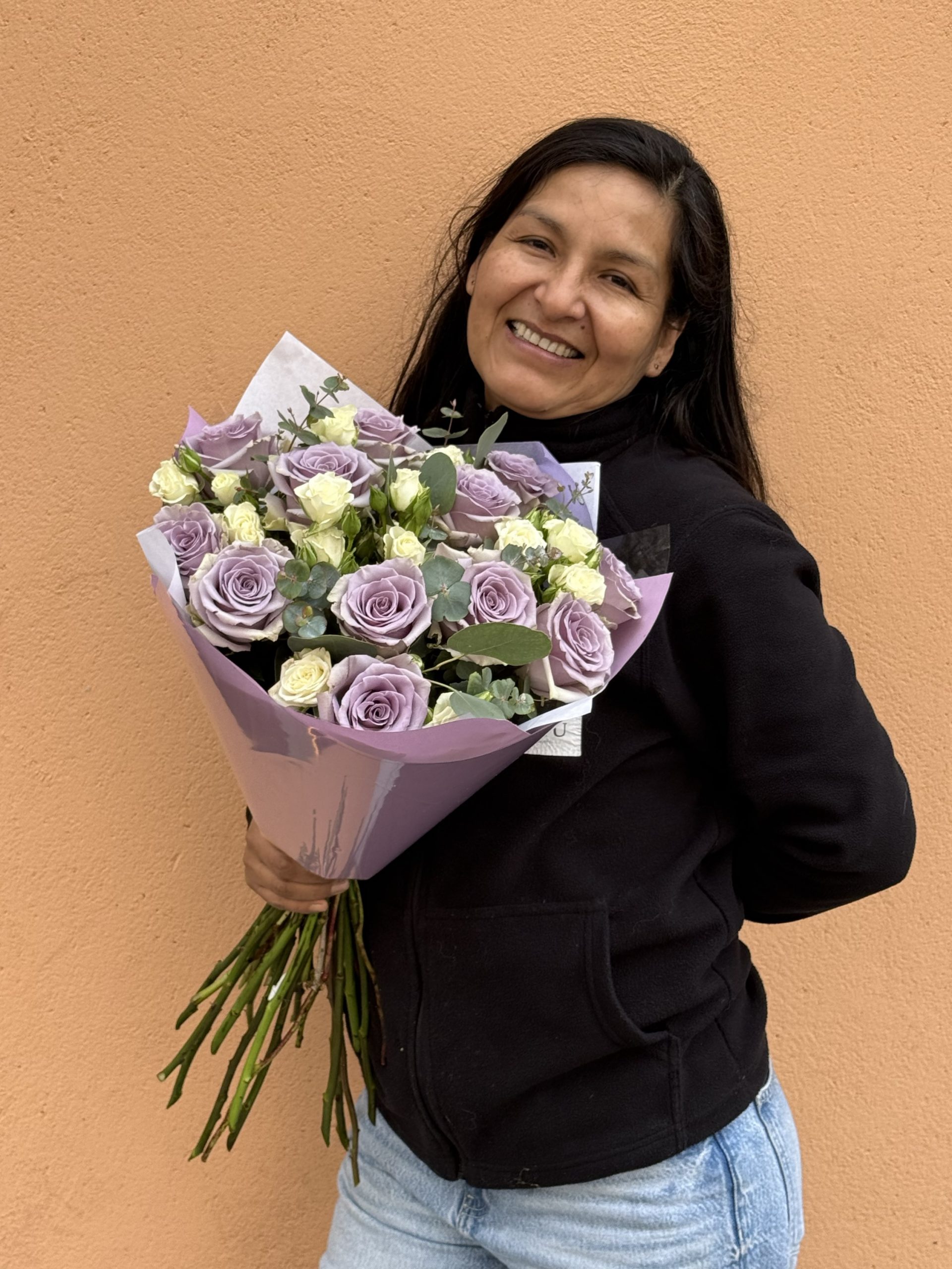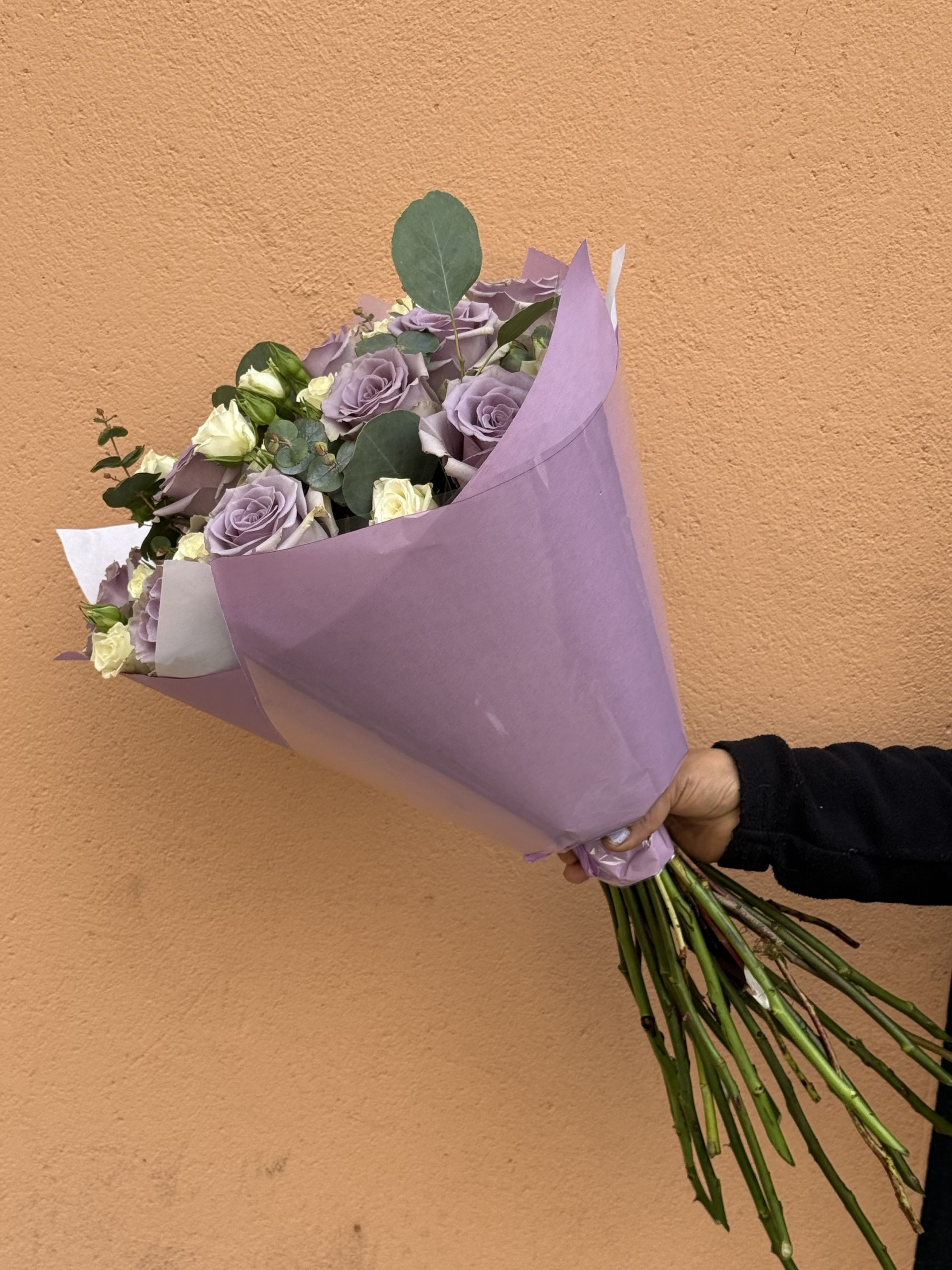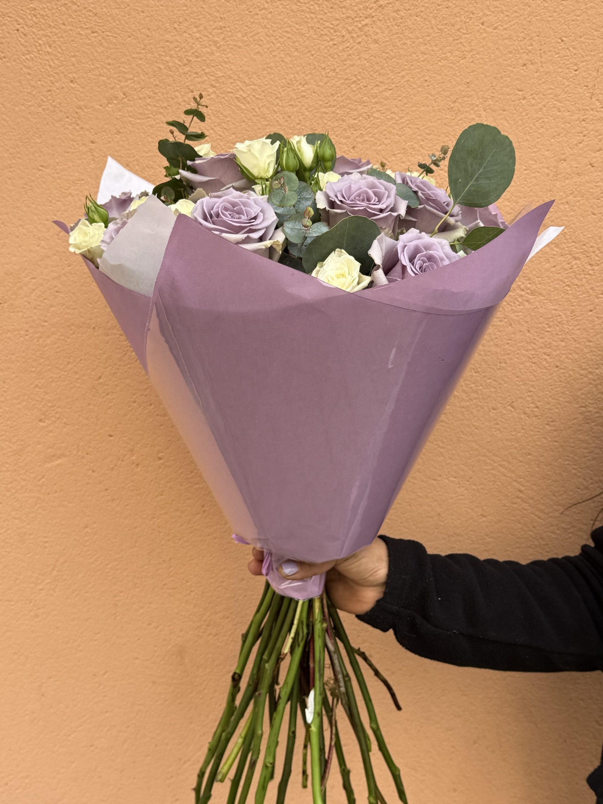 Un ramo delicado y sofisticado que transmite dulzura, calma y elegancia. Está compuesto por hermosas rosas en tono lavanda, combinadas con rositas spray color crema y toques frescos de eucalipto natural, creando una armonía perfecta de colores suaves y románticos.